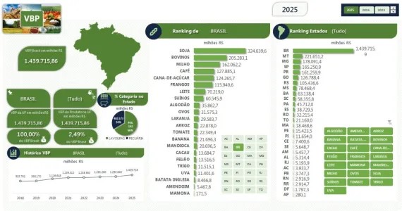 De acordo com o relatório do VBP de abril divulgado pelo Mapa, em Rondônia em relação ao mesmo período de 2024, a pecuária foi a que mais cresceu alcançando 49,15% (saindo de R$ 12.090,4 bi para R$ 18.033,4 bi), mas as lavouras também cresceram 44,20% (saindo de R$ 9.834,6 para R$ 14.181,9 bi).