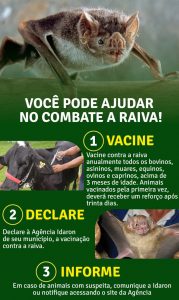 A Idaron reforça que as ações de vacinação no rebanho, monitoramento epidemiológico, orientação a produtores e controle de morcegos hematófagos, estão em andamento. Além disso, alerta que a raiva é uma zoonose que não tem cura e é fatal, que coloca em risco não apenas a pecuária, mas também a saúde humana devido ao contato com animais doentes. “Por isso, é importante que o produtor realize a vacinação anual do seu rebanho”, destaca Ney Azevedo, coordenador do Programa Estadual de Controle da Raiva dos Herbívoros Domésticos.