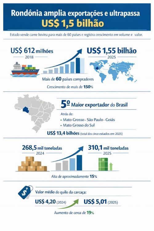 As garantias sanitárias mantidas pelo Estado de Rondônia têm impactado diretamente na abertura e consolidação de mercados internacionais para a exportação de carne bovina e derivados. Em 2025, o estado alcançou US$ 1,55 bilhão em exportações do setor, posicionando-se entre os cinco maiores exportadores de carne bovina do Brasil, atrás apenas de Mato Grosso, São Paulo, Goiás e Mato Grosso do Sul. Juntas, essas cinco unidades da federação somaram mais de US$ 13,4 bilhões em vendas externas no período.